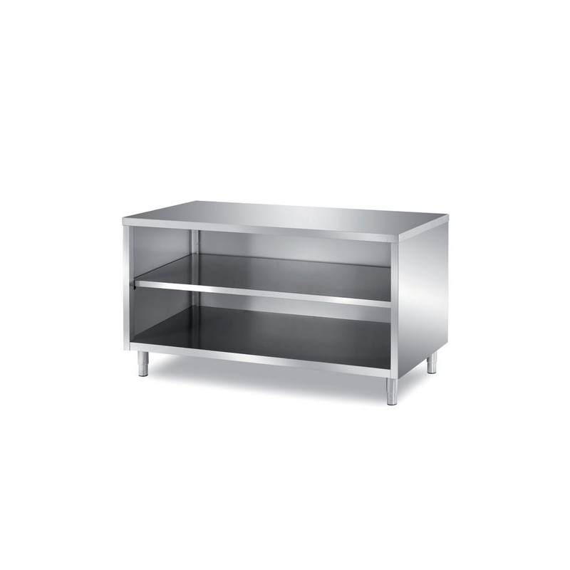 AISI 304 Stainless Steel open cabinet with middle-shelf designed for commercial kitchens and prep areas.