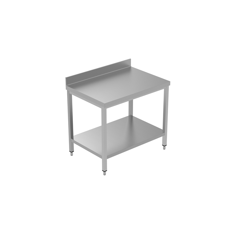 AISI 304 Stainless Steel work table with under shelf and backsplash designed for commercial kitchens and prep areas.