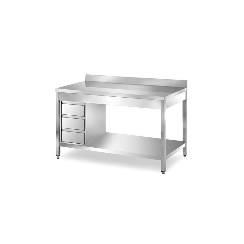 AISI 304 Stainless Steel tables on legs with side set of 3 drawers unit with backsplash designed for commercial kitchens and prep areas.
