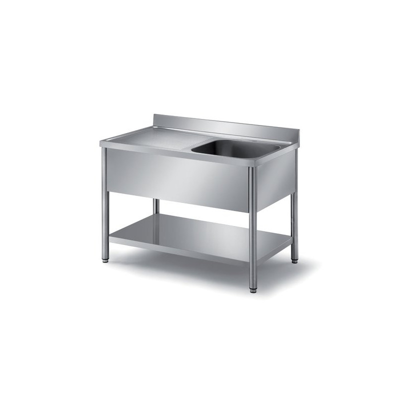 AISI 304 Stainless Steel table 1 bowl sink with under shelf and backsplash designed for commercial kitchens and prep areas.